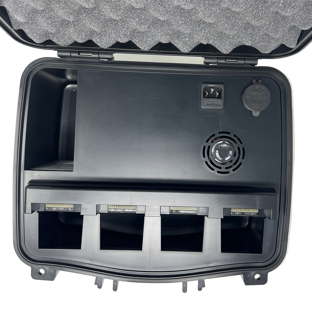 The Colorado Drone Chargers Skydio X2 PRCS (Portable Rapid Charging System) is a multi-battery drone charging system designed to rapidly charge four (4) batteries and two (2) USB accessories simultaneously. With the ability to charge four batteries at the same time, we give you more flight time with less batteries. That means you’ll buy less batteries and carry less batteries in the field.