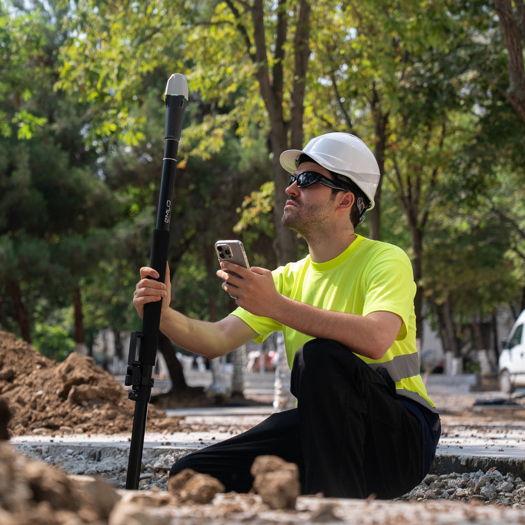 Capture points with a tilted pole while maintaining RTK precision. Typical specification: RTK + 2 mm + 0.3 mm/° of tilt error. That means fast, reliable shots near walls, slopes, or tight spaces where bubble leveling slows you down.