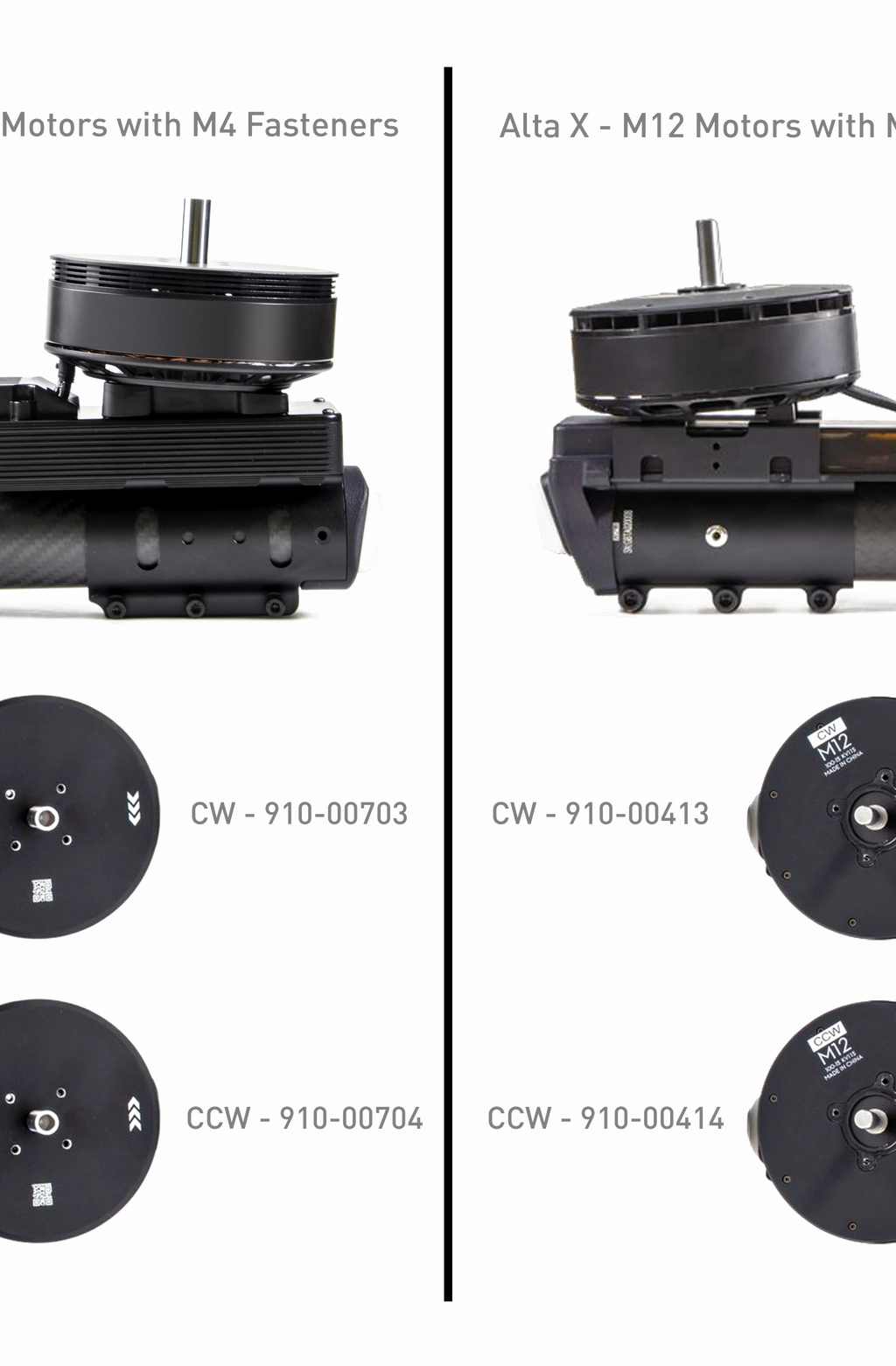 Freefly Alta X motors with CCW rotation on boom 1 or boom 3 that use M4 fasteners at the prop hub.
